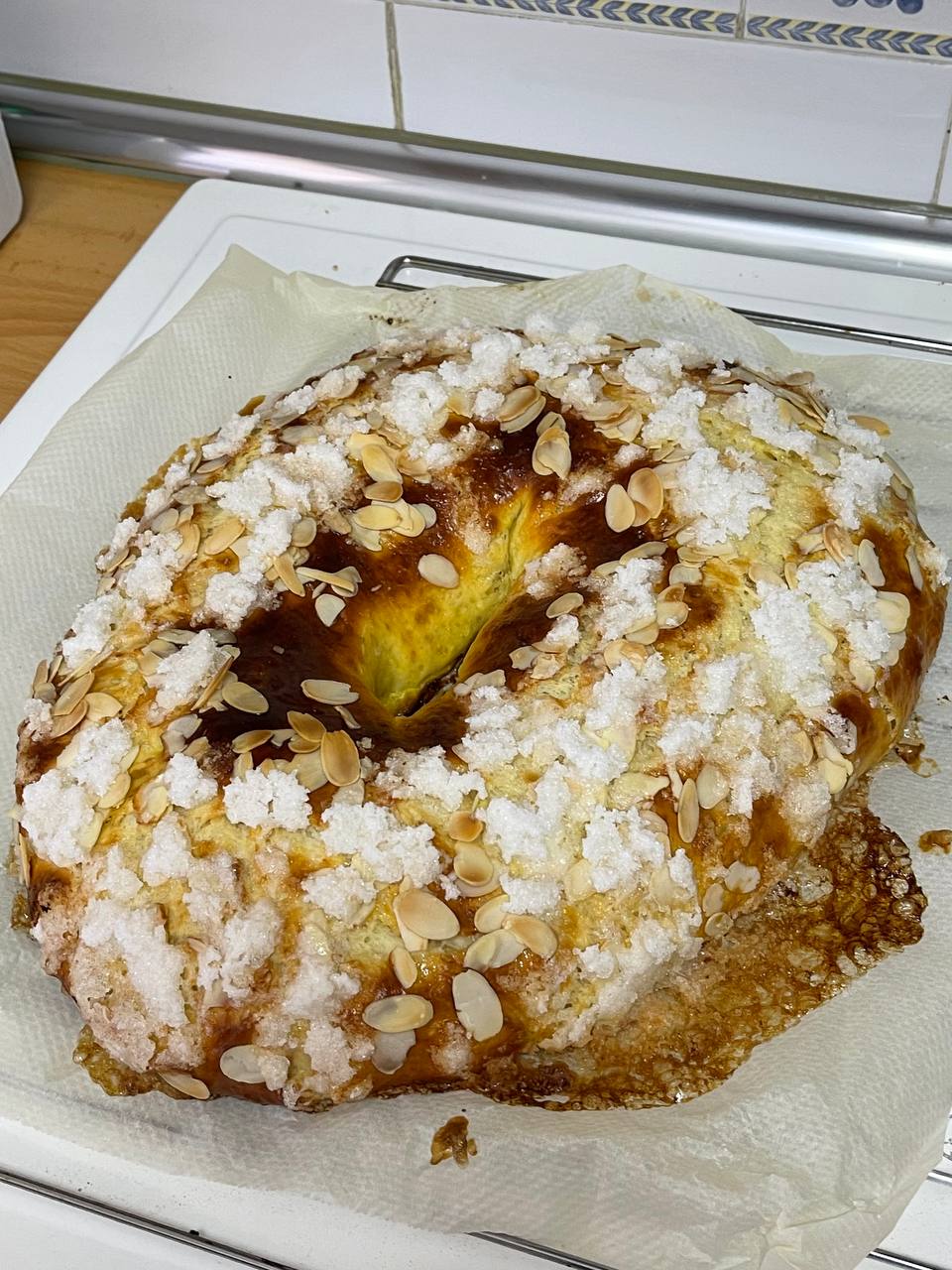 Una vez haya reposado al menos 2 horas y la masa haya doblado su tamaño ya podemos decorar y hornear el Roscón: